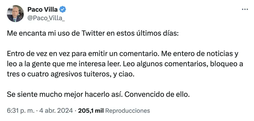 “Me encanta mi uso de Twitter en estos últimos días: Entro de vez en vez para emitir un comentario. Me entero de noticias y leo a la gente que me interesa leer. Leo algunos comentarios, bloqueo a tres o cuatro agresivos tuiteros, y ciao. Se siente mucho mejor hacerlo así. Convencido de ello”