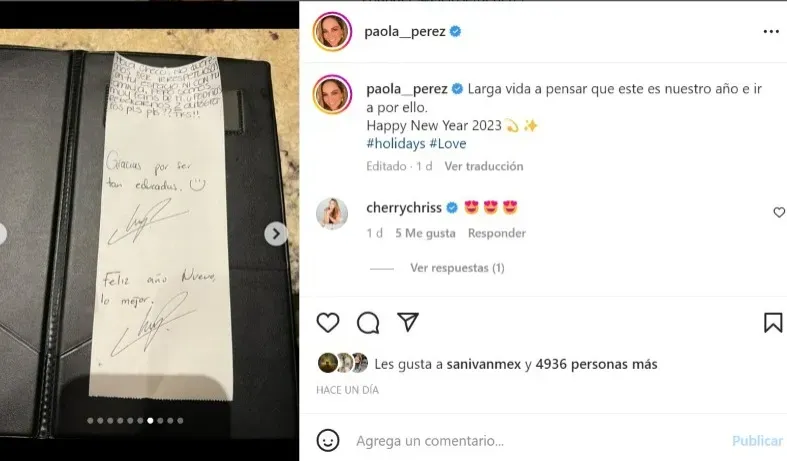 Justo en la serie de fotos que compartió Paola aparece el ticket con las firmas de su hermano. “Gracias por ser educadas”, el tierno detalle que tuvo Checo Pérez con unas meseras.