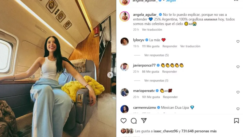 Por medio de sus redes, Ángela Aguilar posteó una fotografía suya en lo que parece un jet privado vestida de celeste y blanco. “No te lo puedo explicar, porque no vas a entender. Corazón 25% Argentina, 100% orgullosa hoy, todos somos más celestes que el cielo” fue el mensaje.