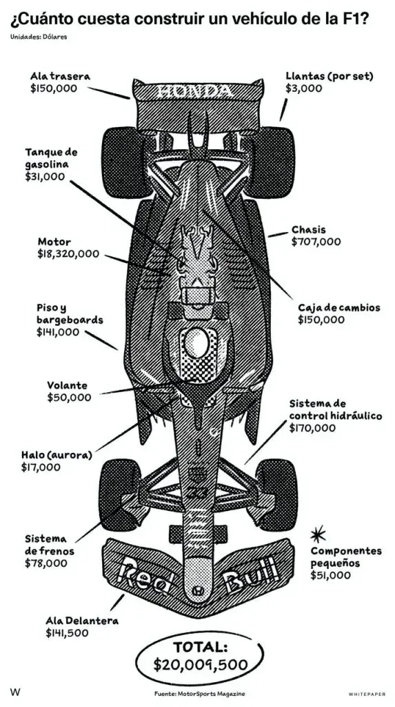 Con todos los sistemas de tecnología, y por el material que está hecho, un monoplaza de Fórmula 1 ronda en los 20 millones de dólares. Lo más caro es el motor, que está en unos 18 millones.