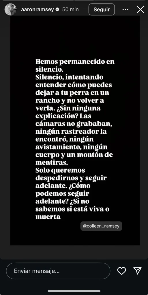 Aaron Ramsey se refirió a que han tratado de comprender cómo puede ser que confíen en el cuidado de su mascota a un rancho y después no saber qué ocurrió. Y dejó ver que la incertidumbre los está acabando a él y a su familia, por no saber absolutamente nada sobre Halo.