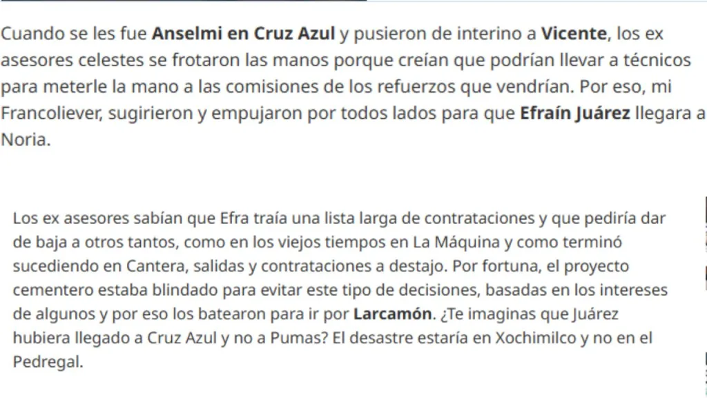 El proyecto que había para Cruz Azul no admitía bajas y contrataciones “basadas en los intereses de algunos”. Por lo que decidieron no ir con la opción de Efraín Juárez para tomar las riendas del equipo y lo batearon. Así que continuaron con su búsqueda hasta concretar lo de Nicolás Larcamón.