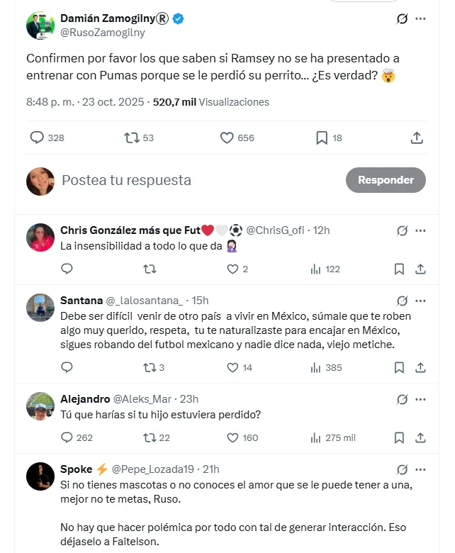 Eso fue hace casi 2 semanas, y a pesar de que el todavía futbolista de Pumas no encuentra a su pequeño Halo. No ha dejado de pedir ayuda para encontrar a su mascota. Pese a ello, el Ruso Zamogilny solo se limitó a preguntar, pero muchos no se lo tomaron a bien. Y por eso también le respondió a Faitelson por sus equivocados señalamientos y le pidió que practicara la lectura de comprensión.
