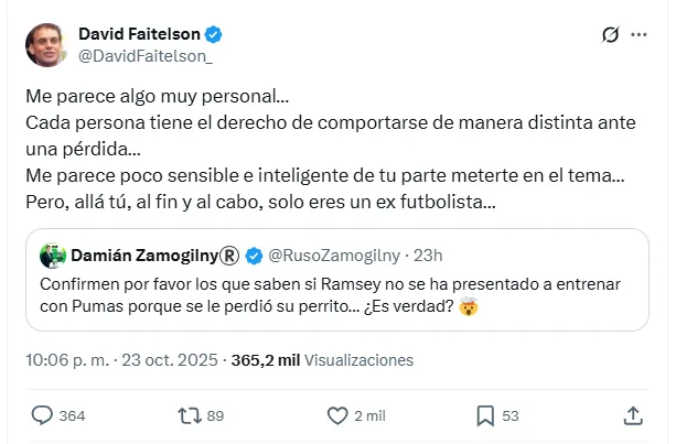 Ante esto, las críticas contra el comentarista de TUDN estallaron y una de ellas fue la de Faitelson, quien lo tachó de insensible por no entender el dolor del jugador de Pumas y su familia. Quienes recordemos que perdieron a su mascota en su viaja a San Miguel de Allende, Guanajuato.