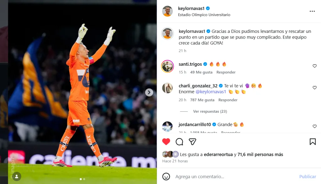 Keylor Navas utilizó sus redes sociales para sincerarse por lo sucedido en el estadio Olímpico Universitario en donde los Pumas empataron de milagro 2-2 con Cruz Azul. Lo que ocasionó que el excancerbero del Real Madrid no ocultara que la situación fue complicada para él y el resto de sus compañeros.