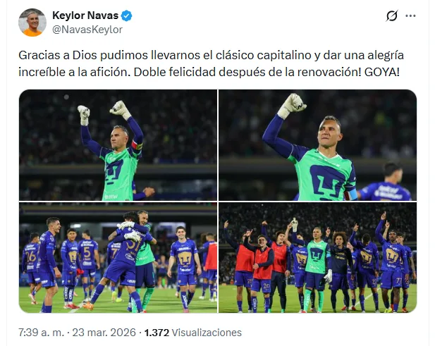 A través de sus redes sociales, Keylor Navas agradeció el apoyo de los seguidores auriazules en el Estadio Olímpico Universitario, escenario donde Club América cayó ante su acérrimo rival en un duelo de alta intensidad.