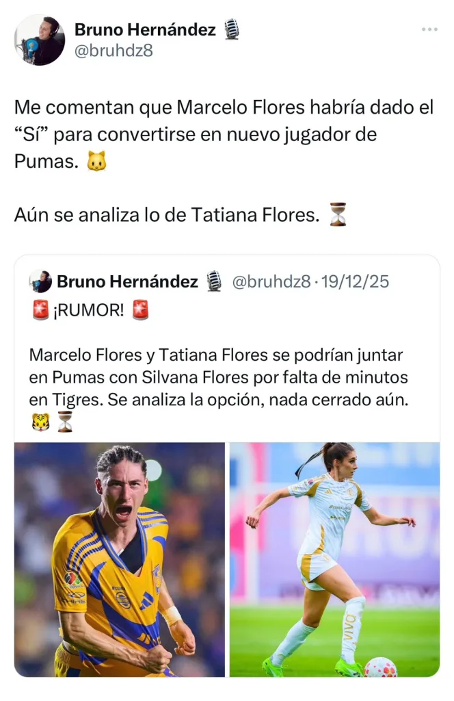 El periodista ya había soltado el rumor de que Marcelo Flores dejara a Tigres para irse a Pumas. Su intención es buscar minutos de juego en la cancha, pues con los de la UANL ha sido complicado ganarse un lugar debido a la cantidad de figuras que tiene.