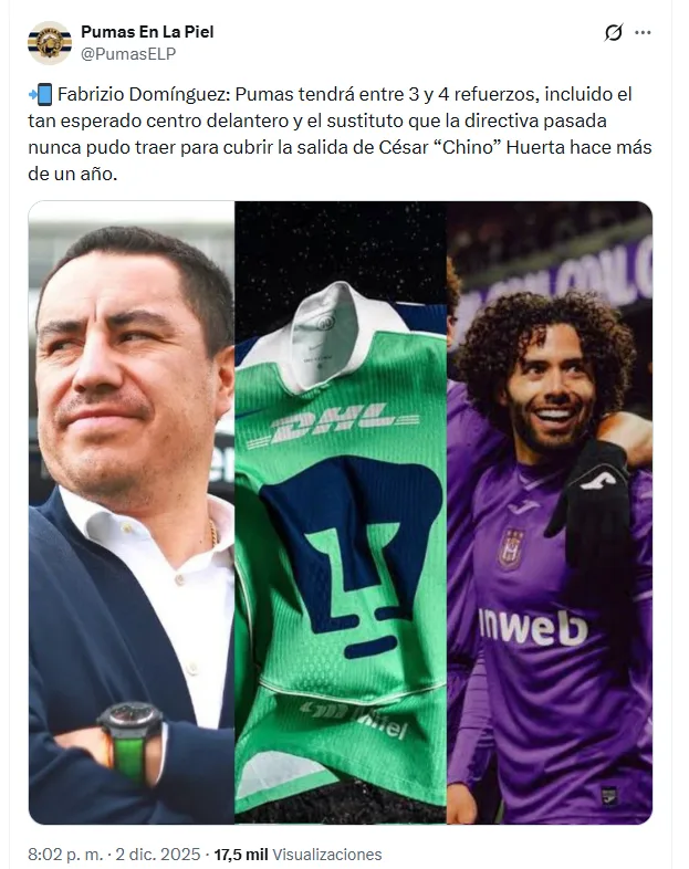 - Pumas por fin buscará al reemplazo de Chino Huerta, quien se fue del equipo en 2024.