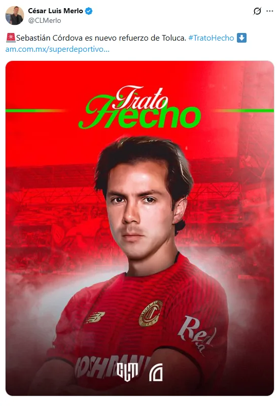“Es un hecho. Los Diablos Rojos del Toluca actuales bicampeones de la Liga MX han cerrado el fichaje de Sebastián Córdova por lo que gozarán de sus servicios de cara al nuevo torneo Clausura 2026”.