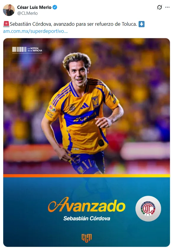 De acuerdo con lo que reveló el periodista sobre el tema, Córdova ya tendría negociaciones avanzadas con el Toluca, y su fichaje sería anunciado muy pronto por parte de los actuales bicampeones de la Liga MX.