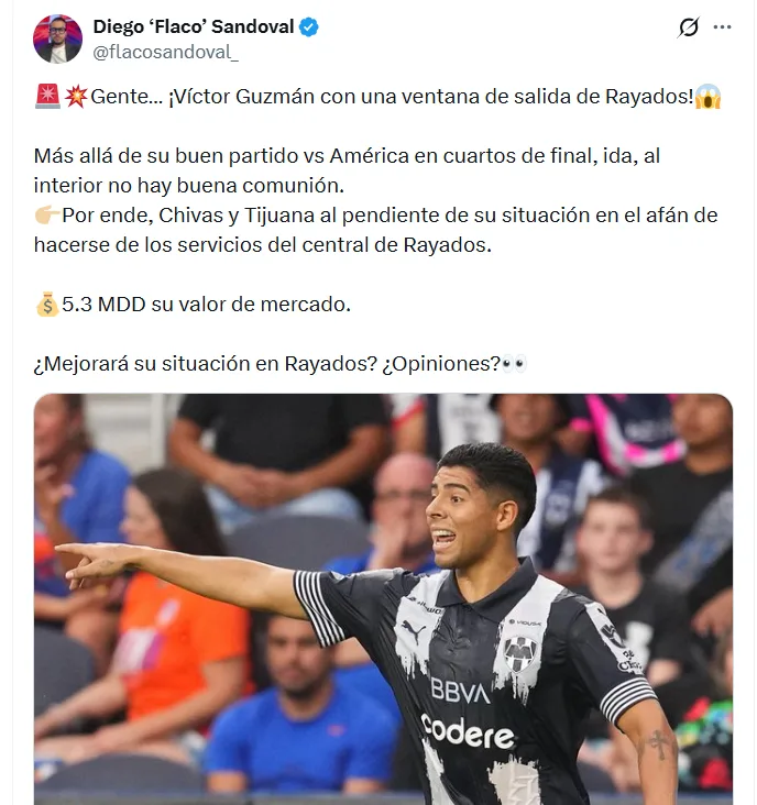 Con información de Diego Sandoval de W Deportes, se dio a conocer que los Rayados de Monterrey ya no contemplarían en sus planes a Víctor Guzmán. Pues según la fuente citada, ya no habría una buena comunión entre el equipo y el futbolista mexicano