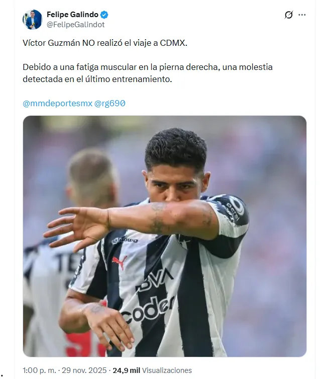 Con información de Felipe Galindo de Multimedios Deportes se dio a conocer que, de última hora, Rayados de Monterrey no dejó que Víctor Guzmán hiciera el viaje a la Ciudad de México. Pues habría presentado una fatiga muscular en la pierna derecha. Así que tendrá que ver este enfrentamiento desde la Sultana del Norte y por televisión.