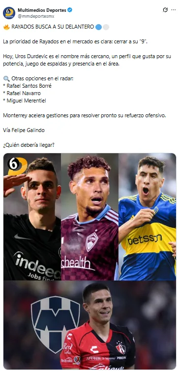Pero hasta que no se confirme no podremos saber si el Monterrey le echará el guante a Rafael Santos Borré, Rafael Navarro o Miguel Merentiel. O si al final sí se les hace el milagro de llevarse a Djuca.