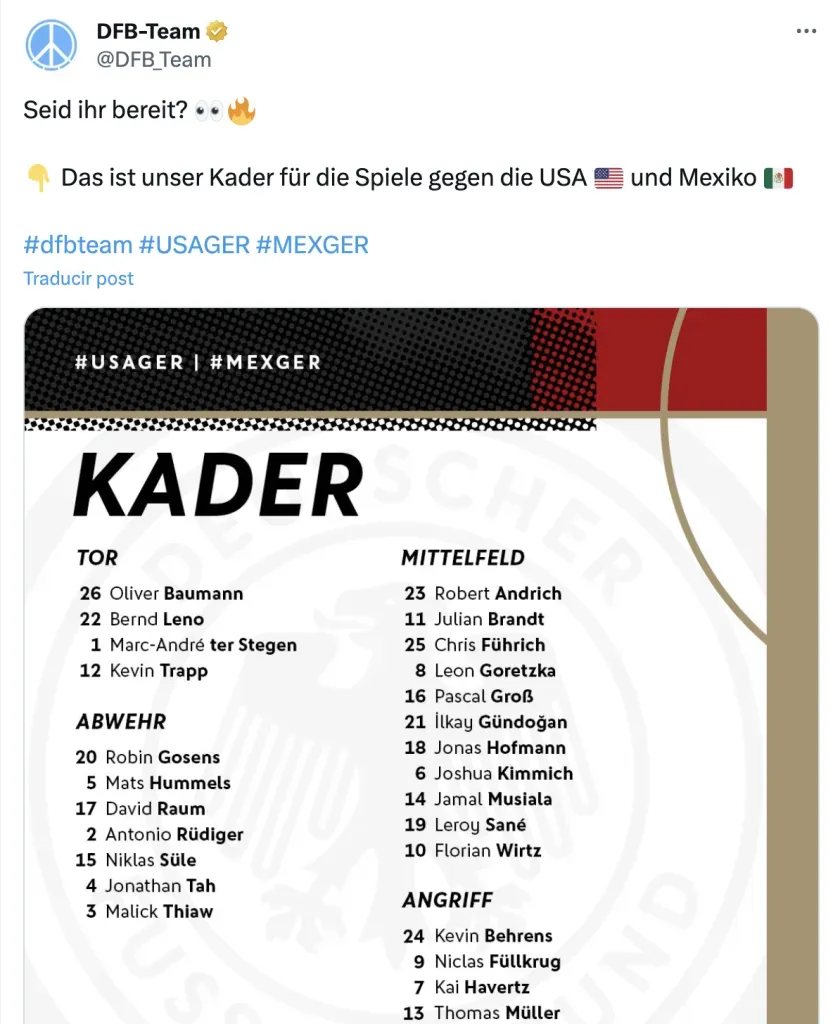 Este viernes los teutones confirmaron su convocatoria que tendrán para medirse ante México y Estados Unidos la próxima semana.