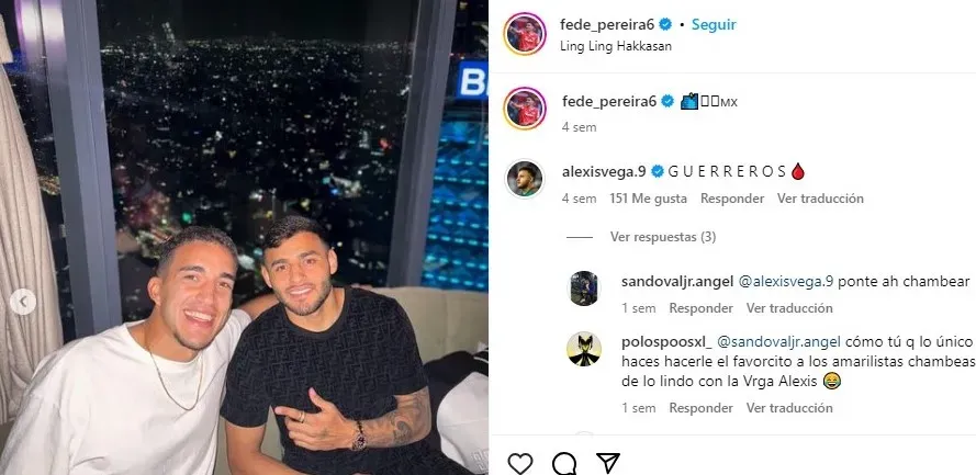 Fue el propio Vega y sus amigos, quienes presumieron haberse ido de fiesta previo al duelo ante Pachuca. Pues publicaron imágenes de cómo la pasaron en uno de los restaurantes más caros de la Ciudad de México. En donde se le ve a Vega con otro jugador de los escarlatas, Federico Pereira en el Ling Ling Hakkasan, sin agobio alguno por concentrarse ni nada por el estilo.