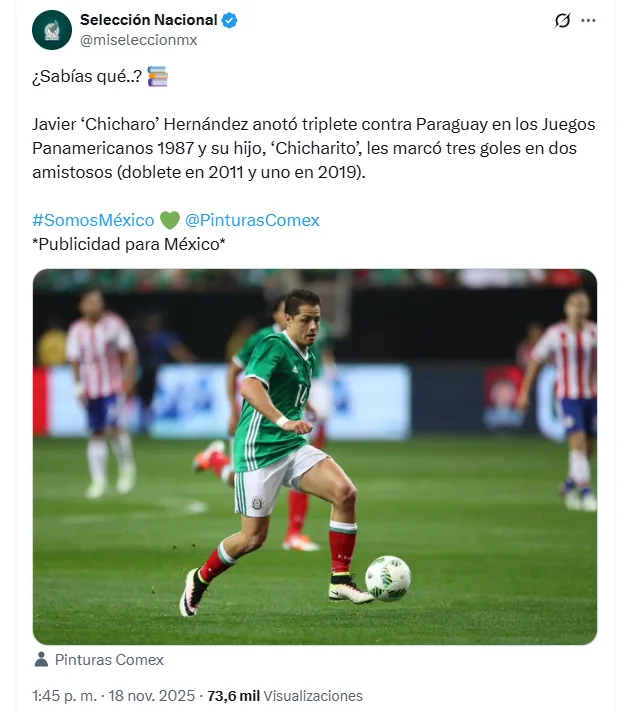 En la publicación que hizo el Tri Mayor sobre Chicharito. Destacaron no solo el daño que le hizo en su momento a Paraguay, sino también su padre en los Juegos Panamericanos en 1987. Aunque la única fotografía que compartieron es la del futbolista de las Chivas de Guadalajara