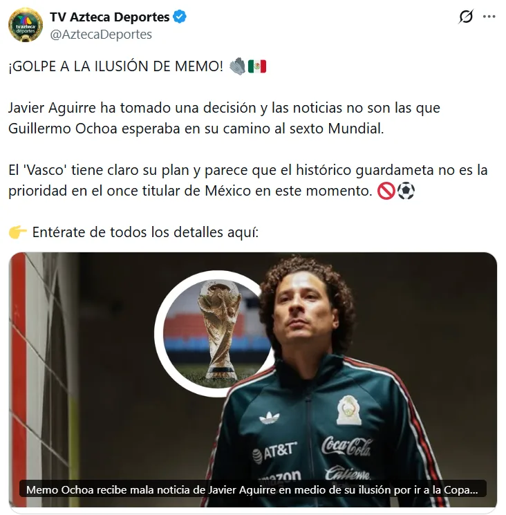 De acuerdo con una reciente revelación de los amigos de Mediotiempo, Memo Ochoa irá al Mundial 2026 pero para ayudarle a Javier Aguirre a desarrollar a Tala Rangel y Carlos Acevedo.