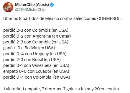 El periodista y especialista en datos, MisterChip ha publicado en sus redes sociales los últimos resultados que ha tenido la Selección Mexicana de mayores contra rivales sudamericanos. Vale aclarar que la reciente derrota ante Argentina en el Mundial Sub-20 no es tomada en cuenta.