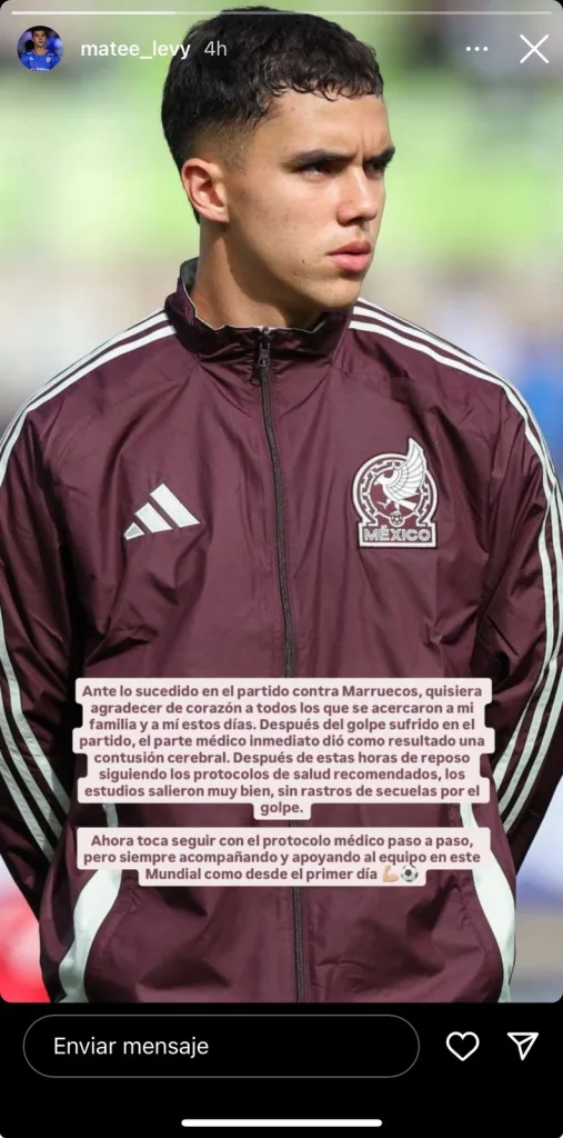 A sólo unos días de haber salido del partido México vs Marruecos en el Mundial Sub 20 por una conmoción cerebral, Mateo Levy rompió el silencio. El futbolista brindó detalles del golpazo que se llevó y reveló los pasos que está siguiendo para su recuperación. Pero se perfila para ser baja en los octavos de final.