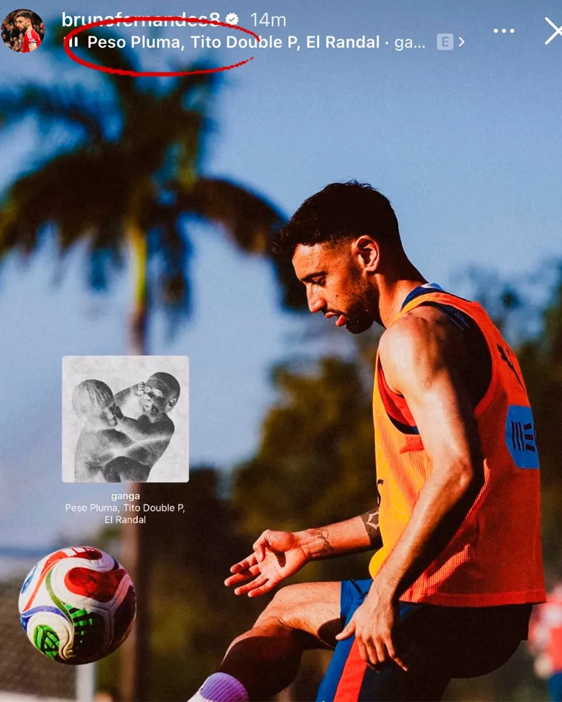 Bruno Fernandes subió a sus stories una imagen de él entrenando pero acompañó esta foto con música de Peso Pluma, con lo que generó emoción en los mexicanos al ver que una figura del Manchester United ya anda pendiente de la cultura local.