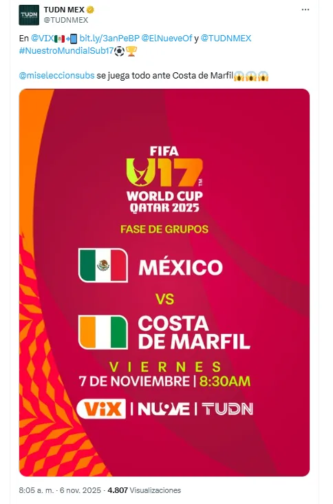 Este partido podrás verlo no solo por las pantallas de TUDN en televisión de paga, o de VIX por streaming. También será transmitido GRATIS por el canal 9 de televisión abierta. Donde podrás disfrutar del partido de la Selección Mexicana Sub-17.