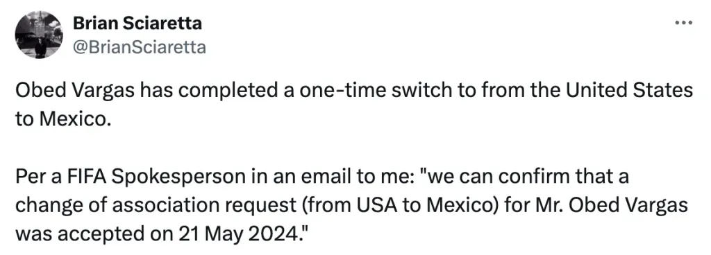 “Obed Vargas ha completado un cambio único (One-Time Switch) de Estados Unidos a México. Según un portavoz de la FIFA que me envió un correo electrónico: ‘podemos confirmar que el 21 de mayo de 2024 se aceptó una solicitud de cambio de asociación (de EE. UU. a México) para el Sr. Obed Vargas’”