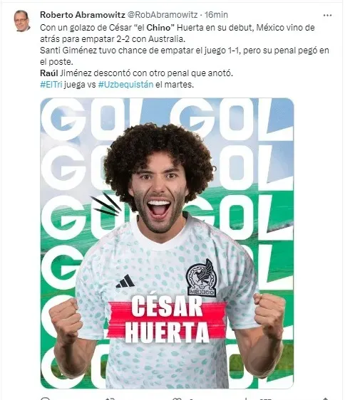 Poco después, César Chino Huerta se hizo presente en el marcador y logró romper las redes, y de esta manera anotar su primer gol como seleccionado.