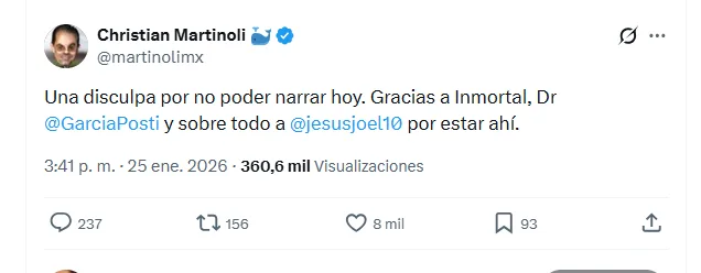 Lo que estaría explicando por qué no revelaron en la transmisión su baja de última hora, pues los encargados de hacerse cargo fueron Luis García. Acompañado del revelo de Martinoli, Jesús Joel Fuentes. Y posteriormente el comentarista lanzó un escueto mensaje en sus redes sociales para disculparse con los aficionados.