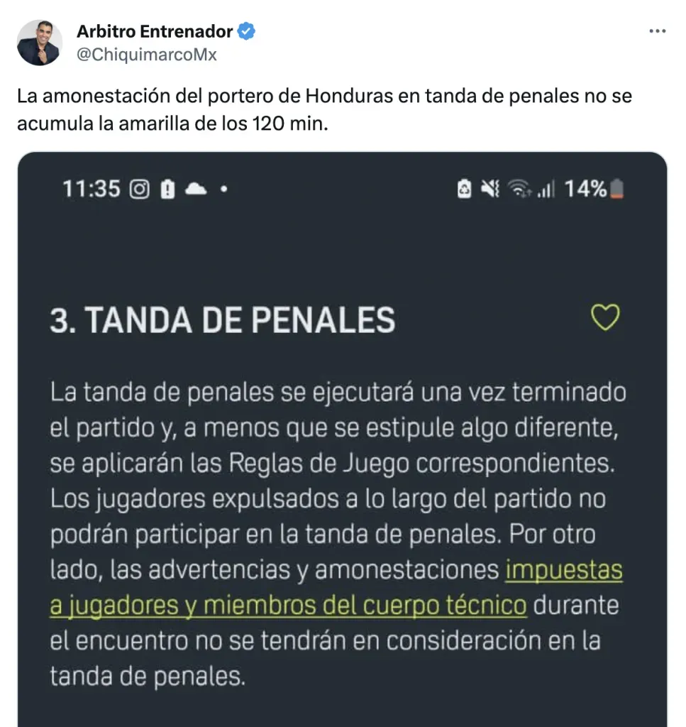 “La amonestación del portero de Honduras en tanda de penales no se acumula la amarilla de los 120 minutos”, escribió en redes sociales Chiquimarco, ampliando su explicación en una imagen en donde narró parte del raglamento.