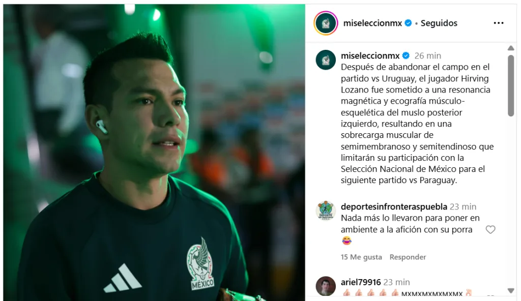 Según lo publicado por la Selección Mexicana en sus redes sociales, Chucky Lozano presenta una sobrecarga muscular de semimembranoso y semitendinoso en el músculo esquelética del muslo posterior izquierdo.