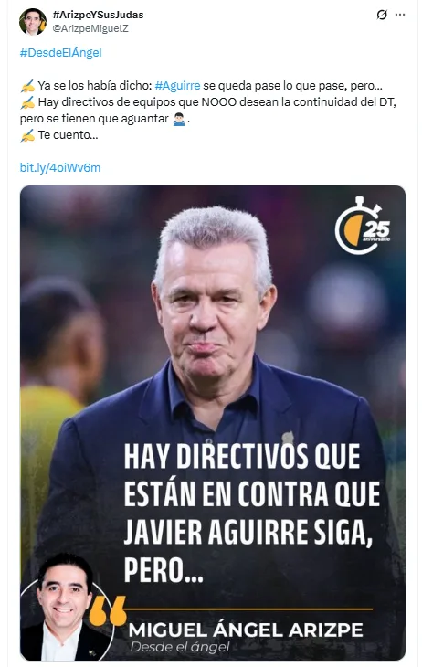 Fue Miguel Arizpe en su más reciente columna nombrada “Hay directivos que están en contra que Javier Aguirre siga, pero…”. Quien señaló que los dueños de los equipos de la Liga MX, en su mayoría no quieren la continuidad de Javier Aguirre como entrenador de la Selección Mexicana.