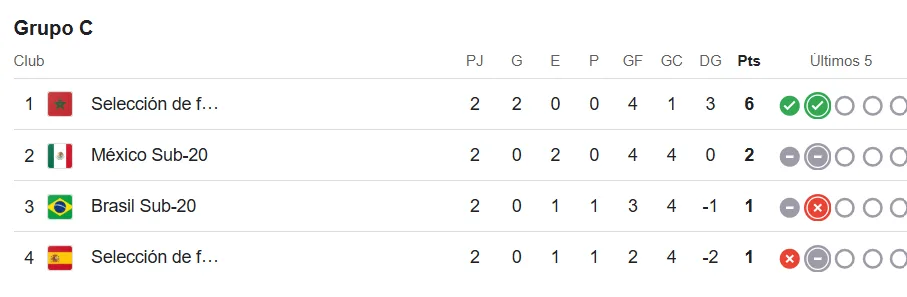 La Selección Mexicana es parte del grupo C del Mundial Sub 20, y tras haber disputado dos partidos, se mantiene momentáneamente en la segunda posición con 2 puntos, aunque podría modificarse la tabla luego del encuentro que dispute Marruecos vs Brasil.