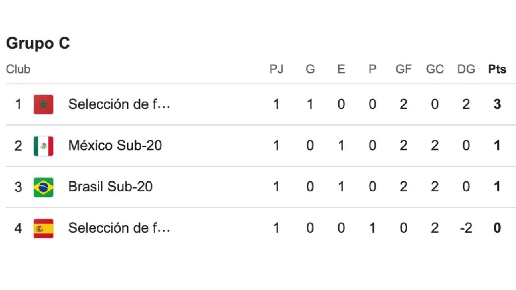 La Selección Mexicana es parte del grupo C del Mundial Sub 20, y tras haber disputado una jornada, se ubica en la segunda posición, pues el primer peldaño lo ocupa momentáneamente Marruecos, que se impuso ante España.