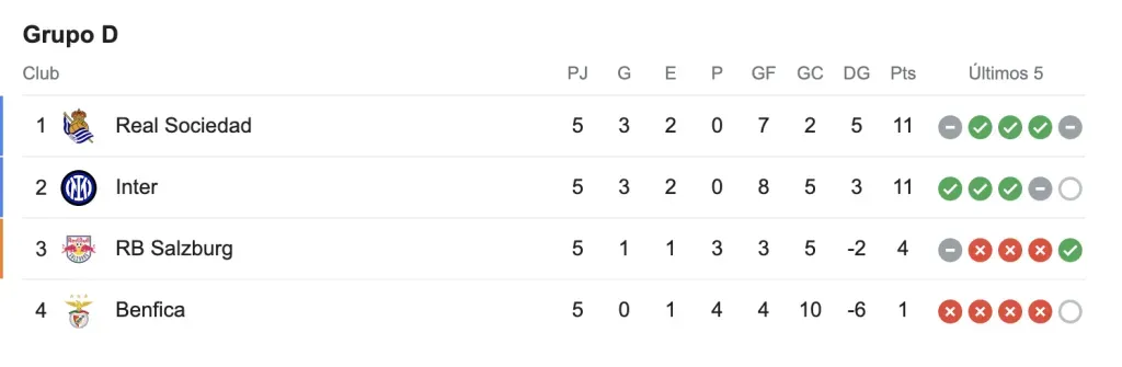 Luego de los resultados conseguidos esta tarde, la Real Sociedad se mantiene en la cima de su grupo al sumar 11 unidades, sellando su boleto a los octavos de final, misma situación que el Inter, que con la misma cantidad de puntos, selló su pase a la siguiente instancia.